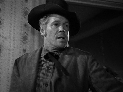 who makes the most of his bit part, and John McIntire is the gunrunning Indian Trader who fleeces Dutch, who doesn’t take kindly to that and tries to pull his gun. Riker was anticipating that. Riker, pointing a shotgun, “Ya should’na done that Dutch. You can have one on the house before ya leave.” Dutch Henry, getting pissed off, “Who said I’m leavin’!?!” Riker, stolidly, “Yer leavin’.” That dangling cig is just marvelous. This scene is what noir is all about, frankly.
